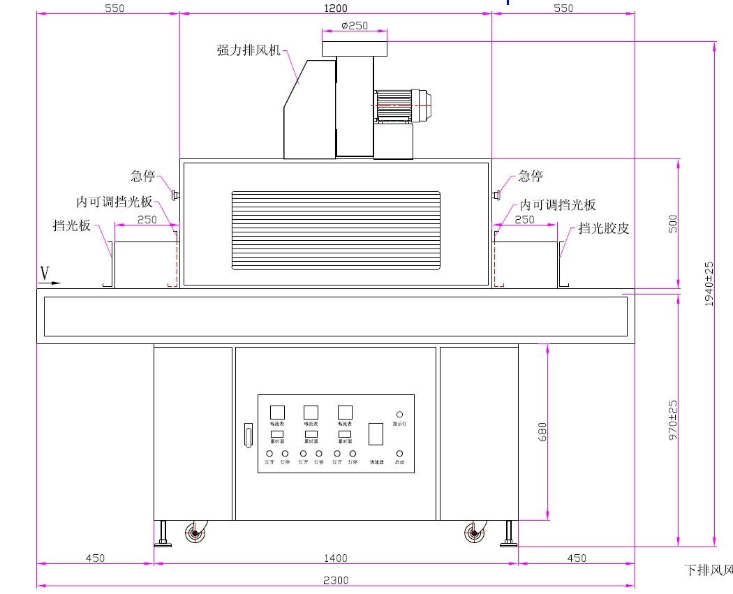 本設備采用3.0kW×3汞燈配置,主波峰365nm,搭配不銹鋼網帶輸送(0~7m/min)及上下排風系統,適用于ABS等多種材質表面絲印油墨的高效固化。配備進口反射器、漏電開關及累時器,確保安全穩定運行。