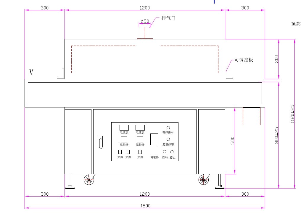 隧道爐專為圓形鋰電池熱縮管封裝設(shè)計,采用半面鍍白中波輻射管(單根700W),發(fā)熱管分布于工件兩側(cè)、頂部及底部,結(jié)合無級調(diào)速特氟龍網(wǎng)帶(300mm寬)實現(xiàn)均勻加熱1。設(shè)備配備雙溫區(qū)控制,加熱溫度達150℃,輸送速度0-3m/min,外殼采用冷軋鋼板噴塑+不銹鋼內(nèi)膽結(jié)構(gòu),支持上箱翻蓋維護,超溫自動斷電報警,適配220V電源