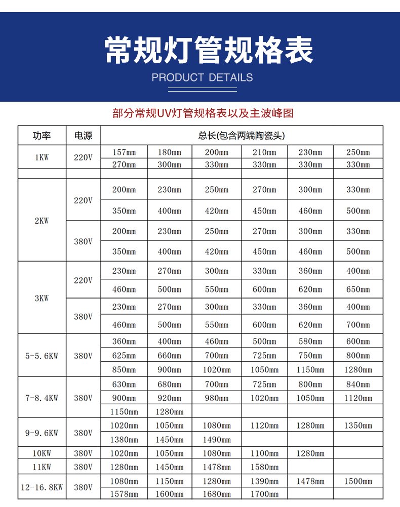 這款UV燈管專為各行業(yè)打造。主波峰310nm-410nm、功率400W-18kw、長度120mm-1179mm、管徑Φ22.5mm-Φ25mm皆可定制。220V-380V供電,純鎢電極,800-1000h質(zhì)保。能滿足