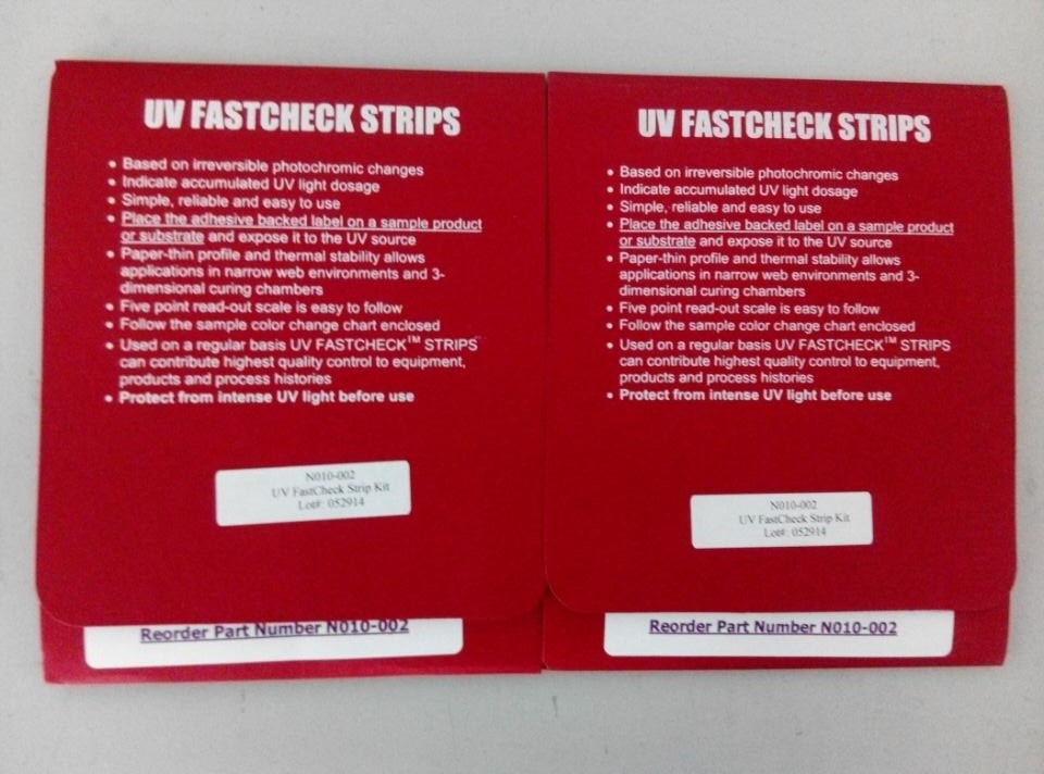 UV測試紙的使用是一種簡單有效用以測試UV強(qiáng)度的方法。在測試紙上有五個小格,分別可以對不同強(qiáng)度的UV光作出反應(yīng)并改變顏色。用此種測試紙可以簡單方便地對UV光源進(jìn)行檢測,從而斷定設(shè)備上的UV強(qiáng)度是否還足夠用來固化所需的產(chǎn)品。
